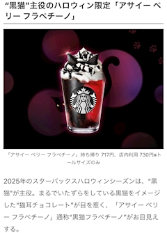 こんばんは! スタバの新作で出るハロウィン限定フラペチーノがとてもとても気になっています!! アサイー大好き人間なのでアサイーベリーは絶対飲みに行かないとですね🫐 毎年出るハロウィンシーズンの新作楽しみなんですよね 本日10/6月曜 20:30~ 出勤です🤍 お待ちしております! みどり💚